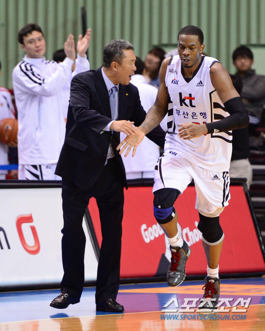 12일 오후 서울 잠실실내체육관에서 2014-2015 프로농구 부산 KT와 서울 삼성의 경기가 열렸다. 3쿼터 슛을 성공시킨 KT 로드가 전창진 감독과 하이파이브를 나누고 있다. 잠실실내체= 김경민 기자 kyungmin@sportschosun.com / 2014.11.12. |