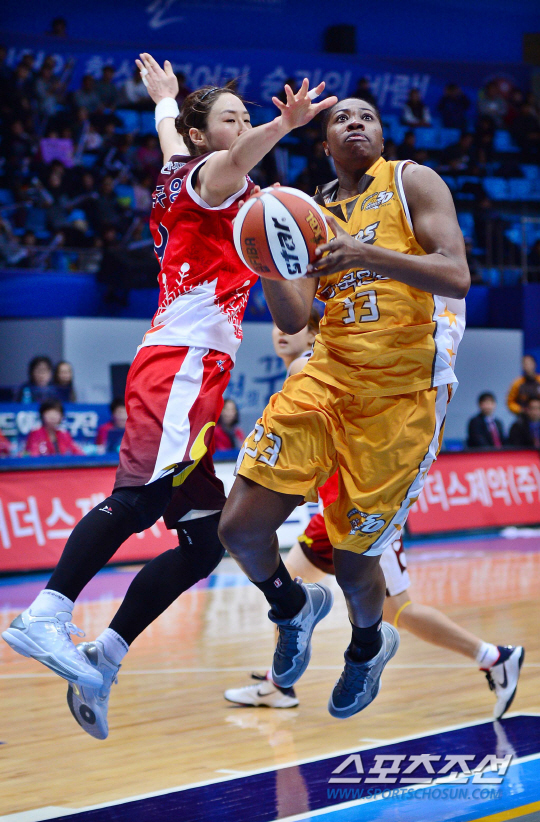 22일 오후 인천 도원체육관에서 2014-2015 여자프로농구 KB 스타즈와 신한은행의 경기가 열렸다. KB 스타즈 비키바흐(오른쪽)가 신한은행 곽주영의 마크를 넘어 슛을 시도하고 있다. 인천=김경민 기자 kyungmin@sportschosun.com / 2014.12.22.
