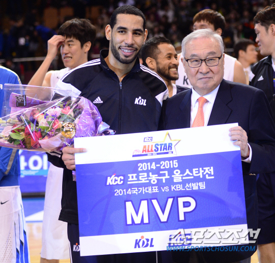2014-2015 프로농구 올스타전 KBL 선발팀과 국가대표팀의 경기가 10일 서울 잠실실내체육관에서 열렸다. 115-112로 승리를 거둔 KBL선발팀의 문태영이 MVP를 수상하고 있다. 김영기 총재와 함께 포즈를 취하고 있는 모습. 잠실=정재근 기자 cjg@sportschosun.com/2015.01.10/