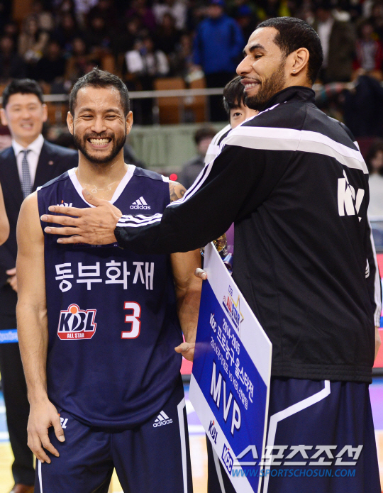 2014-2015 프로농구 올스타전 KBL 선발팀과 국가대표팀의 경기가 10일 서울 잠실실내체육관에서 열렸다. 115-112로 승리를 거둔 KBL선발팀의 문태영이 MVP를 수상했다. 문태영이 함께 MVP를 경쟁했던 전태풍을 위로하고 있다. 잠실=정재근 기자 cjg@sportschosun.com/2015.01.10/ |