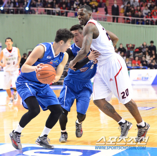 2014-2015 프로농구 올스타전 2일차 시니어 매직팀과 주니어 드림팀의 경기가 11일 오후 잠실실내체육관에서 열렸다. 시니어 매직팀 양동근이 주니어 드림팀 라틀리프를 마크하고 있다. 1987년생(28세) 이상 선수들이 주축이 된 시니어 매직팀 베스트5는 양동근(모비스), 슈터 조성민(KT), 문태종(LG), 문태영(모비스), 오세근(28·이상 KGC인삼공사) 그 이하 선수들로 이뤄진 주니어 드림팀은 김선형(SK), 이재도(KT), 김준일(삼성), 이승현, 트로이 길렌워터(이상 오리온스)로 짜여졌다. 잠실실내체=김경민 기자 kyungmin@sportschosun.com / 2015.01.11. |