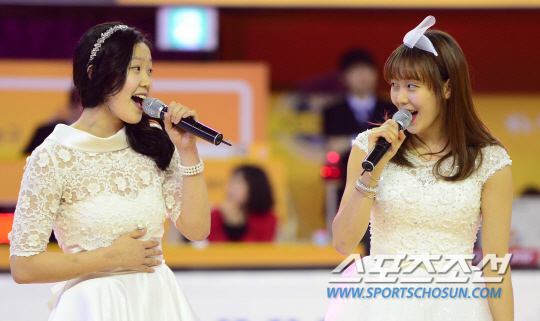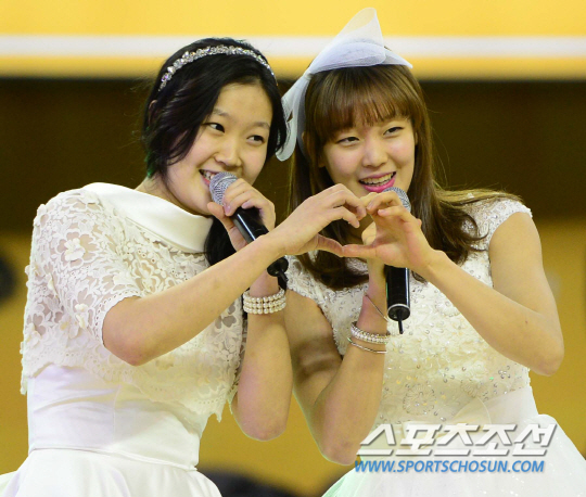 홍아란(23·KB스타즈)와 신지현(20·하나외환)이 예쁜 드레스 차림에 노래를 부르면서 코트 중앙으로 걸어 들어왔다. 둘은 이번 2014~2015시즌 KB국민은행 여자농구에서 가장 주목받는 '핫 걸'이다. 남자들의 보호본능을 자극하는 소녀 이미지로 많은 사랑을 받고 있다.