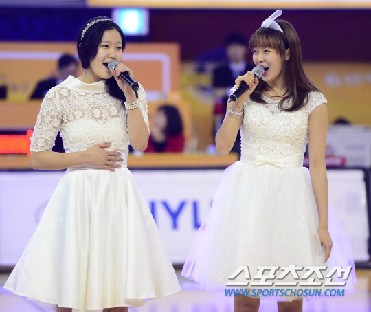 홍아란(23·KB스타즈)와 신지현(20·하나외환)이 예쁜 드레스 차림에 노래를 부르면서 코트 중앙으로 걸어 들어왔다. 걸음걸이부터 떨렸다. 둘은 이번 2014~2015시즌 KB국민은행 여자농구에서 가장 주목받는 '핫 걸'이다. 남자들의 보호본능을 자극하는 소녀 이미지로 많은 사랑을 받고 있다.