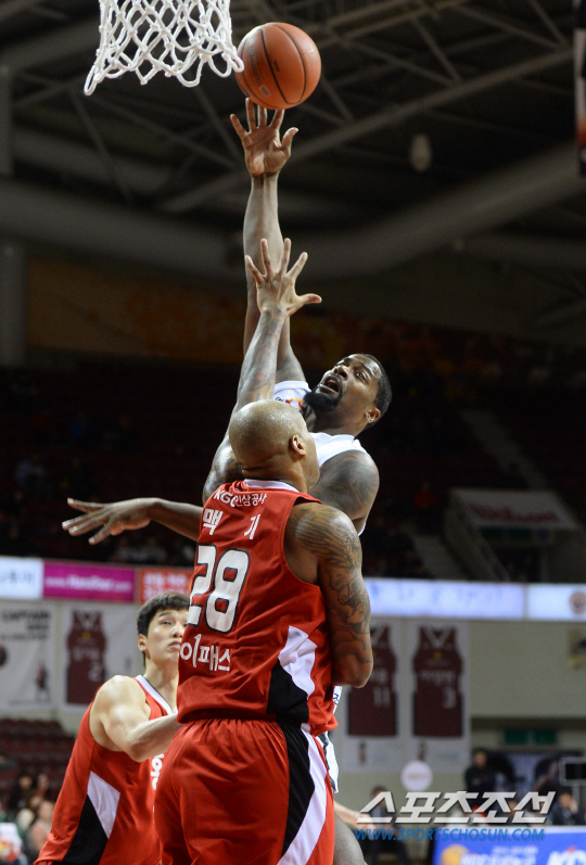 2014-2015 프로농구 안양KGC와 창원LG의 경기가 7일 안양실내체육관에서 열렸다. 창원LG 메시가 안양KGC 맥기의 수비사이로 레이업 슛을 시도하고 있다. 안양=최문영 기자 deer@sportschosun.com /2015.01.07/
