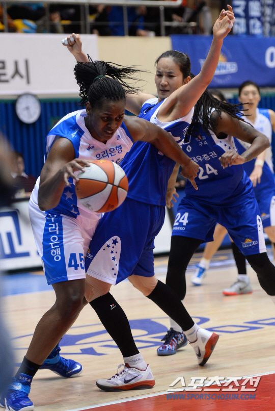 2014-2015 여자프로농구 KDB생명과 우리은행의 경기가 5일 구리체육관에서 열렸다. 우리은행 굿렛이 KDB생명 신정자의 수비사이로 돌파를 시도하고 있다. 구리=최문영 기자 deer@sportschosun.com /2015.01.05/