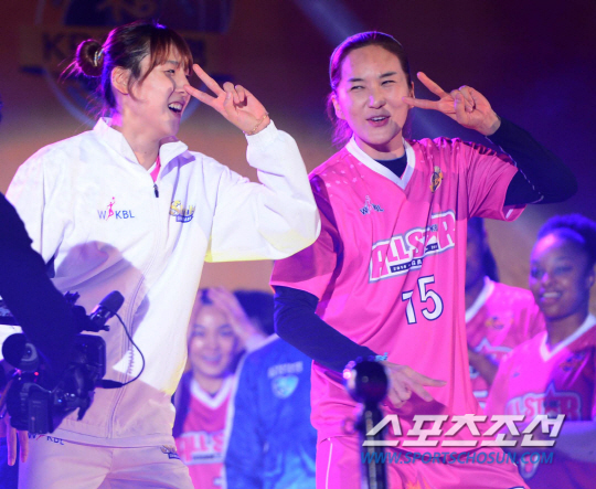 | 올스타전에서 춤을 추고 있는 신정자(오른쪽)와 김단비 . 청주=김경민 기자 kyungmin@sportschosun.com / 2015.01.18. |