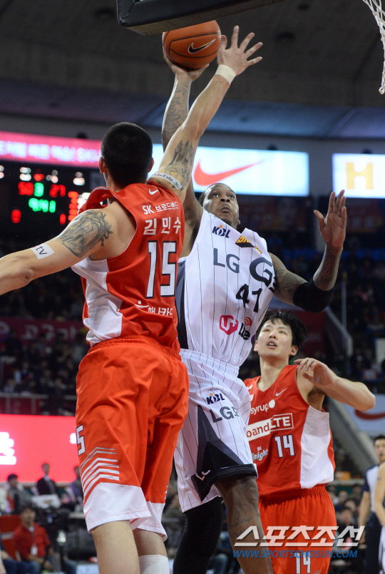 2014-2015 프로농구 서울SK와 창원LG의 경기가 2일 잠실학생체육관에서 열렸다. LG 제퍼슨이 SK 김민수의 수비사이로 레이업슛을 시도하고 있다. 잠실=최문영 기자 deer@sportschosun.com /2015.02.02/ |