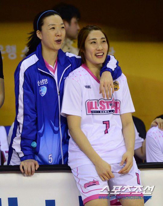 18일 오후 청주 실내체육관에서 2014-2015 여자프로농구 올스타전에서 3점슛 컨테스트에서 우승을 차지한 박하나(오른쪽)가 팀 동료 이미선과 경기를 지켜보고 있다. 청주=김경민 기자 kyungmin@sportschosun.com / 2015.01.18. |
