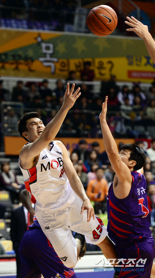 | ◇지난해 12월 31일 오리온스 전에서 모비스 이대성이 이대성이 중심을 잃으면서도 레이업슛을 시도하고 있다.스포츠조선 DB |