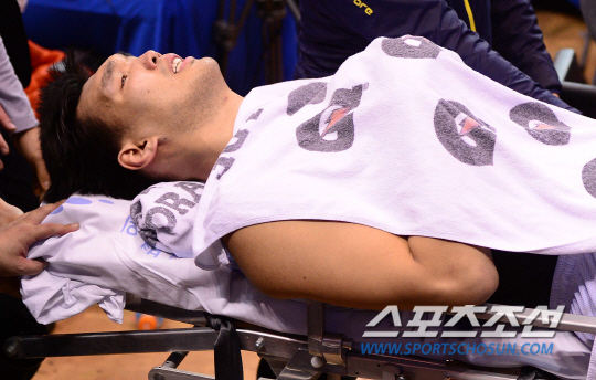 6일 오후 서울 잠실실내체육관에서 2014-2015 프로농구 KCC와 삼성의 경기가 열렸다. 라인을 벗어나는 볼을 살리다 벤치쪽으로 넘어진 KCC 하승진이 부상을 당해 들것에 실려나며 울고 있다. 잠실실내체=김경민 기자 kyungmin@sportschosun.com / 2015.02.06. |