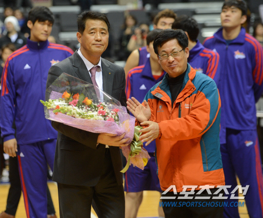 고양 오리온스와 창원 LG의 2014-2015 프로농구 경기가 15일 고양실내체육관에서 열렸다. 오리온스가 104대81로 승리를 거두며 연고 이전 후 100승을 달성했다. 경기 종료 후 오리온스 추일승 감독이 최성 고양시장으로부터 축하의 꽃다발을 받고 있다. 고양=허상욱 기자 wook@sportschosun.com/2015.02.15/