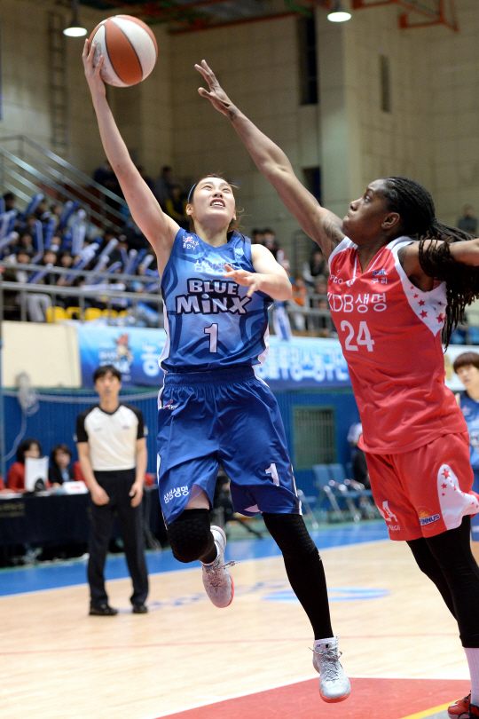 삼성 박하나가 KDB생명 하지스를 앞에 두고 돌파에 이은 슈팅을 시도하고 있다. 사진제공=WKBL