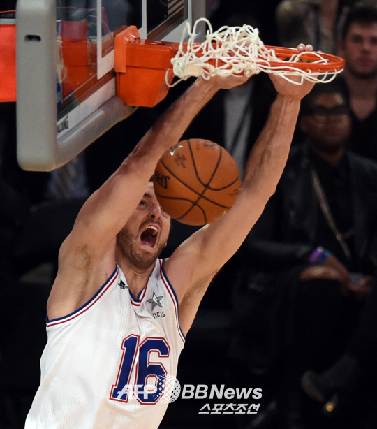 2014~2015 NBA 올스타전 동부 컨퍼런스와 서부 컨퍼런스의 경기가 16일(한국시간) 뉴욕 매디슨 스퀘어 가든에서 펼쳐 졌다. 동부 컨퍼런스 파우 가솔(시카고 불스)이 호쾌한 덩크를 꽂아 넣고 있다.