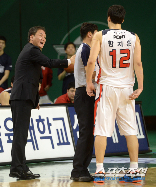 1위와 3위를 달리고 있는 울산 모비스와 원주 동부의 2014-2015 프로농구 경기가 10일 원주종합체육관에서 열렸다. 모비스 유재학 감독이 함지훈에게 작전지시를 하고 있다. 원주=허상욱 기자 wook@sportschosun.com/2015.02.10/