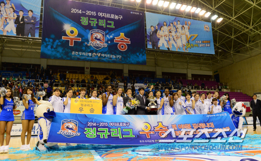 23일 강원도 춘천호반체육관에서 여자프로농구 춘천 우리은행과 구리 KDB생명의 경기가 열렸다. 춘천 우리은행이 KDB생명에 승리하며 정규리그 우승을 확정 짓었다. 우승트로피와 함께 우승의 기쁨을 나누고 있는 우리은행 선수들. 춘천=송정헌 기자 songs@sportschosun.com/2015.02.23