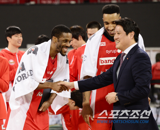 서울 SK와 전주 KCC의 2014-2015 프로농구 경기가 3일 서울 잠실학생체육관에서 열렸다. SK가 89-75로 승리를 거뒀다. 경기 후 KBL 규정에 따라 올시즌을 끝으로 SK와 단독 재계약을 하지 못하고 드래프트에 나오는 헤인즈와 심스가 고별식을 치르고 있다. 문경은 감독이 악수를 나누고 있다. 잠실학생체=정재근 기자 cjg@sportschosun.com/2015.03.03/