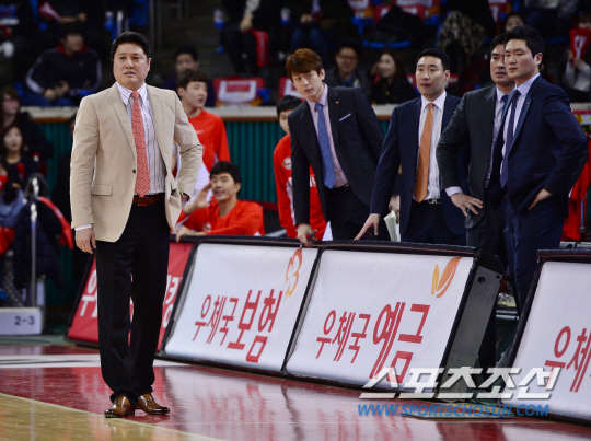 9일 오후 서울 잠실학생체육관에서 2014-2015 프로농구 6강 플레이오프 1차전 전자랜드와 SK의 경기가 열렸다. SK 문경은 감독이 코칭스텝과 경기를 지켜보고 있다. 잠실학생체=김경민 기자 kyungmin@sportschosun.com / 2015.03.09. |