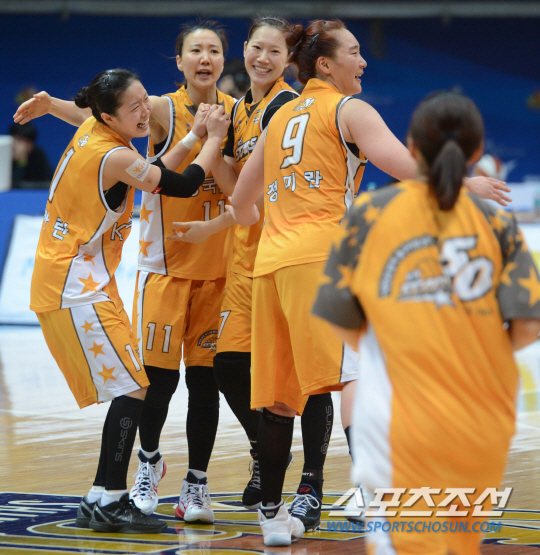 신한은행과 KB스타즈의 2014-2015 여자프로농구 플레이오프 1차전 경기가 15일 인천도원체육관에서 열렸다. KB가 54대51로 승리했다. 경기 종료 후 기쁨을 나누는 KB스타즈 선수들의 모습. 인천=허상욱 기자 wook@sportschosun.com/2015.03.15/