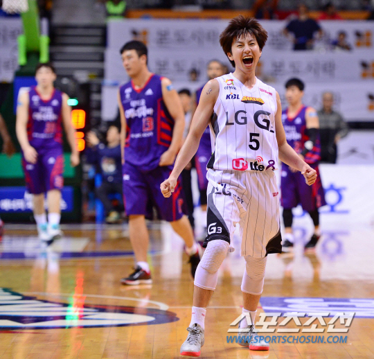 12일 오후 경기도 고양체육관에서 2014-2015 프로농구 6강 플레이오프 3차전 LG와 오리온스의 경기가 열렸다. 4쿼터 역전 3점슛을 성공시킨 LG 김시래가 환호하고 있다. 일산=김경민 기자 kyungmin@sportschosun.com / 2015.03.12. |