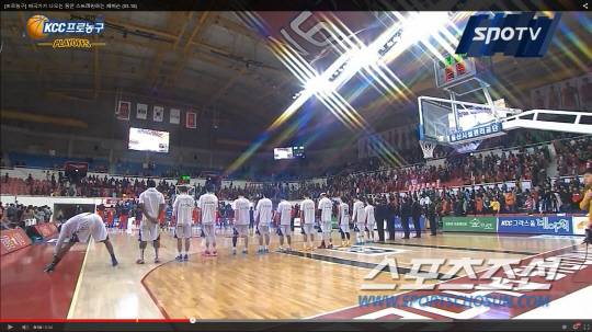 | 제퍼슨이 모비스와의 4강 1차전 직전 애국가가 나오는 도중 스트레칭을 하고 있는 장면. 화면출처=유튜브, SPOTV |