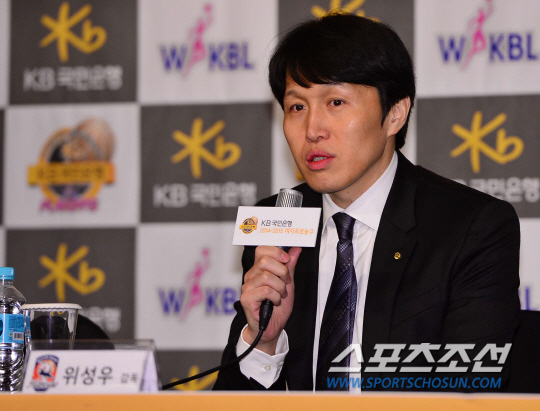 12일 오전 서울 여의도 63시티에서 2014-2015 여자프로농구 플레이오프 미디어데이가 열렸다. 미디어데이에서 우리은행 위성우 감독이 취재진의 질문에 답하고 있다. 김경민 기자 kyungmin@sportschosun.com