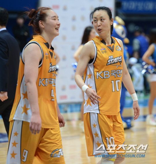 신한은행과 KB스타즈의 2014-2015 여자프로농구 플레이오프 1차전 경기가 15일 인천도원체육관에서 열렸다. KB가 54대51로 승리했다. 경기 종료 후 기쁨을 나누는 KB스타즈 선수들의 모습. 인천=허상욱 기자 wook@sportschosun.com/2015.03.15/