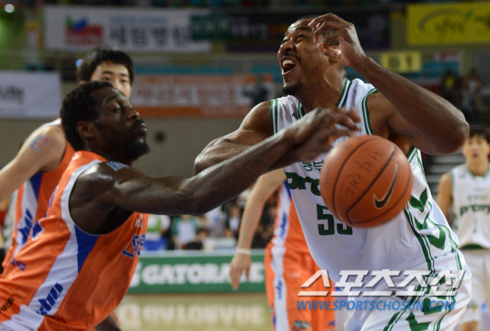 인천 전자랜드와 원주 동부의 2014-2015 프로농구 4강 플레이오프 4차전이 25일 인천삼산월드체육관에서 열렸다. 동부 사이먼이 골밑슛을 시도하다 전자랜드 레더의 수비에 볼을 놓치고 있다. 인천=허상욱 기자 wook@sportschosun.com/2015.03.25/
