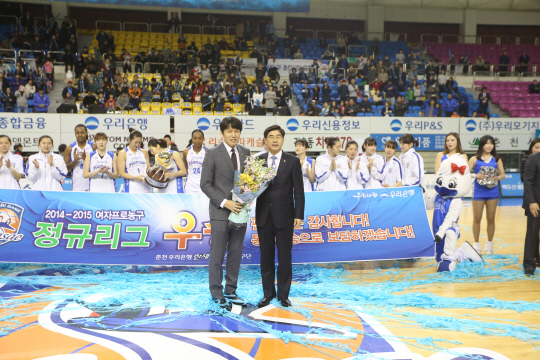 이광구 구단주는 이순우 구단주와는 좀 다른 스타일의 리더십을 보여주었다. 이광구 구단주는 이순우 구단주 못지 않게 농구단에 관심이 지대하다. 그는 은행장 취임사에서 농구단 처럼 강한 은행을 만들자고 했다. 그리고 행장이 된 후 첫 공식 일정으로 지난 1월 1일 춘천 호반체육관을 찾아 우리은행의 경기를 관전하고 선수단을 격려했다. 이광구 구단주(오른쪽)와 위성우 감독이다. 사진제공=우리은행 |