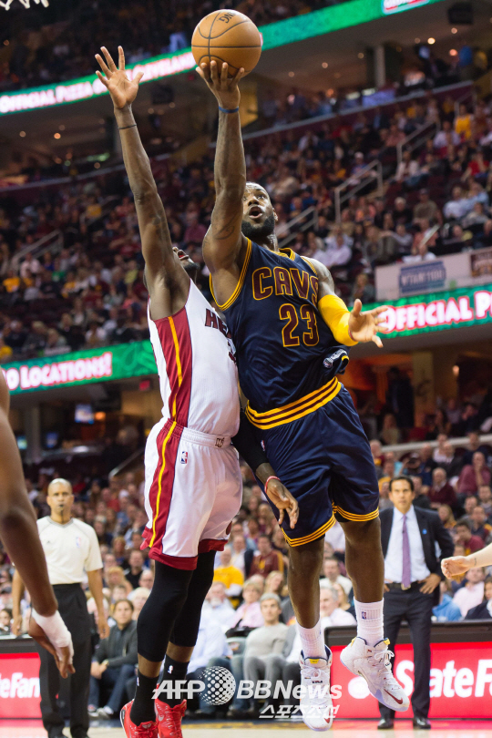 | 클리블랜드의 르브론 제임스가 3일(한국시각) 마이애미전에서 제임스 에니스의 수비를 제치고 슛을 시도하고 있다. 제임스는 이날 23점을 집어넣으며 통산득점 역대 20위로 뛰어올쓋다. ⓒAFPBBNews = News1 |
