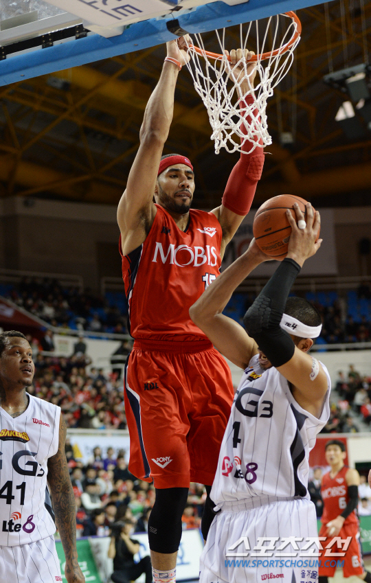 울산 모비스와 창원 LG의 프로농구 4강 플레이오프 1차전이 18일 오후 울산 동천체육관에서 열렸다. 모비스 라틀리프의 슛이 들어간 가운데 리바운드를 잡기 위해 점프했던 문태영과 공을 받는 문태종의 표정이 대조를 이루고 있다. 정규리그 우승을 차지한 모비스는 3월 5일 이후 충분한 휴식을 취하며 4강 플레이오프를 준비해왔다. 반면 LG는 오리온스와 5차전까지 가는 혈투를 치른 후 하루 만에 1위팀 모비스와 대결을 펼치게 됐다. 양팀의 정규리그 성적은 3승 3패로 박빙. 마지막 두 번의 맞대결에서는 LG가 2연승을 거뒀다. 울산=정재근 기자 cjg@sportschosun.com/2015.03.18/