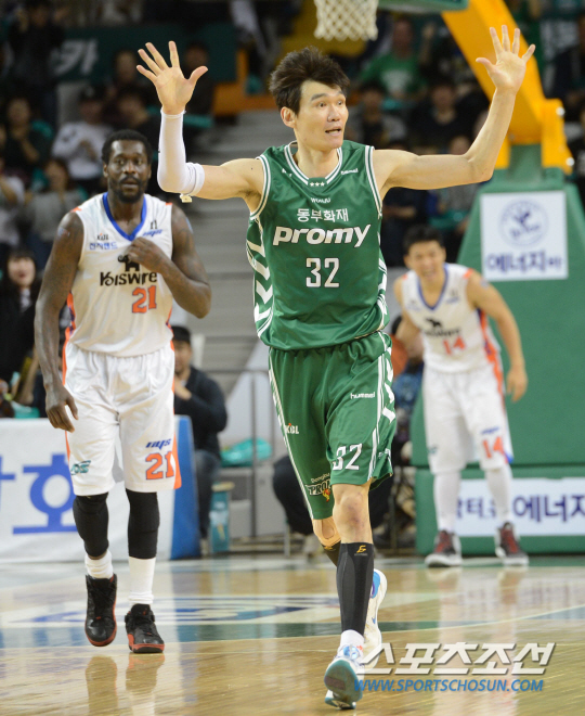원주 동부와 인천 전자랜드의 2014-2015 프로농구 4강 플레이오프 1차전 경기가 19일 원주종합체육관에서 열렸다. 3쿼터 동부 박지현의 3점슛때 팁인을 시도하던 김주성이 볼을 건드리지 않았다는 제스쳐를 취하고 있다. 이후 비디오판독에 의해 3점슛으로 판정됐다. 원주=허상욱 기자 wook@sportschosun.com/2015.03.19/
