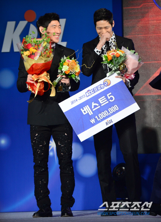 시상식에서 베스트5상을 받은 양동근과 김선형이 환하게 웃고 있다. 김경민 기자 kyungmin@sportschosun.com / 2015.04.14.