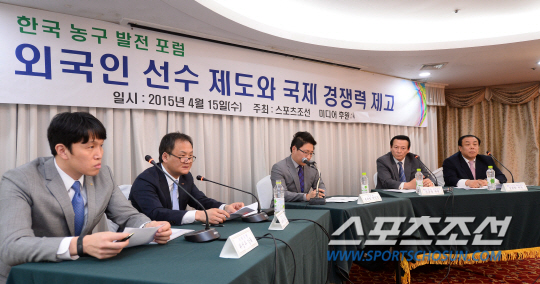 스포츠조선이 개최한 '외국인 선수제도아 국제 경쟁력 제고'란 주제의 한국 농구 발전 포럼이 15일 서울 방이동 올림픽파크텔에서 열렸다. 김완태 창원LG세이커스 단장과 박종천 하나외환 감독의 1부 주제발표에 이어 2부 리얼토크에는 남녀 국가대표 감독을 역임해 아시안게임 동반 금메달을 따낸 모비스 유재학 감독과 우리은행 위성우 감독, 뛰어난 언변과 '돌직구 해설' 로 유명한 김태환, 김동광 해설위원이 패널로 참석했다. 방이동=최문영 기자 deer@sportschosun.com /2015.04.15/
