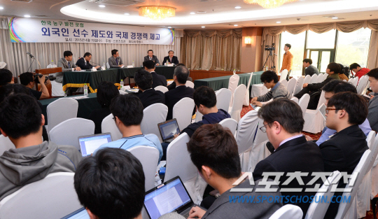 스포츠조선이 개최한 '외국인 선수제도와 국제 경쟁력 제고'란 주제의 한국 농구 발전 포럼이 15일 서울 방이동 올림픽파크텔에서 열렸다. 김완태 창원LG세이커스 단장과 박종천 하나외환 감독의 1부 주제발표에 이어 2부 리얼토크에는 남녀 국가대표 감독을 역임해 아시안게임 동반 금메달을 따낸 모비스 유재학 감독과 우리은행 위성우 감독, 뛰어난 언변과 '돌직구 해설' 로 유명한 김태환, 김동광 해설위원이 패널로 참석했다. 올림픽파크텔=최문영 기자 deer@sportschosun.com