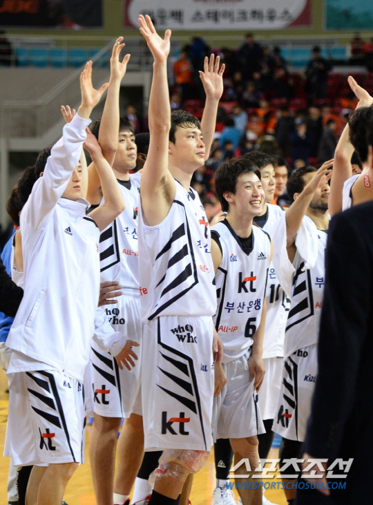 지난 2013~2014시즌 6강 플레이오프 5차전에서 승리해 4강 진출을 확정짓고 팬들을 향해 손을 흔들고 있는 kt 송영진. 최문영 기자 deer@sportschosun.com /2014.03.20/