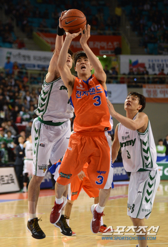 인천 전자랜드와 원주 동부의 2014-2015 프로농구 4강 플레이오프 4차전이 25일 인천삼산월드체육관에서 열렸다. 전자랜드 김지완의 슛팅을 동부 윤호영이 블록슛으로 저지하고 있다. 인천=허상욱 기자 wook@sportschosun.com/2015.03.25/ |