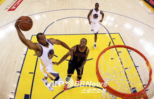 골든스테이트의 안드레 이궈달라(왼쪽)이 클리블랜드와의 NBA 파이널 1차전서 원핸드 덩크슛을 시도하고 있다. ⓒAFPBBNews = News1 |