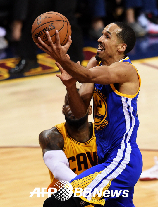 골든스테이트 워리어스의 숀 리빙스턴(오른쪽)이 12일 미국 오하이오주 퀴큰론스에서 열린 2014~2015 NBA 챔피언결정전 4차전에서 클리블랜드 캐벌리어스 르브론 제임스의 수비를 제치고 레이업 슛을 성공하고 있다. ⓒAFPBBNews = News1