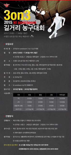 kt 소닉붐(단장 임종택)이 오는 25일과 26일 이틀 동안 부산 해운대 수영만 요트경기장에서 '2015 kt 소닉붐 3on3 길거리 농구대회'를 개최한다.