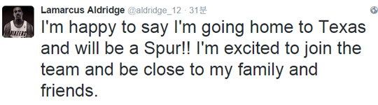 알드리지는 5일(한국 시각) 자신의 SNS에 "내 집이 있는 텍사스로 간다고 말할 수 있게 돼 행복하다. 나는 스퍼스로 간다. 가족과 친구들 가까운 곳에 있는 팀에 입단하게 돼 흥분된다"라고 밝혔다.