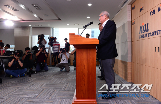 KBL 김영기 총재가 지난달 29일 기자회견을 통해 최근 KT 전창진 감독, 전 현직 선수의 승부조작 및 불법도박 가담 혐의에 대해 공식 사과했다. 또 "재발 방지를 위해 지속적인 관리 감독을 강화해 나가겠다" 고 밝혔다. 조병관기자 rainmaker@sportschosun.com/2015.06.29/