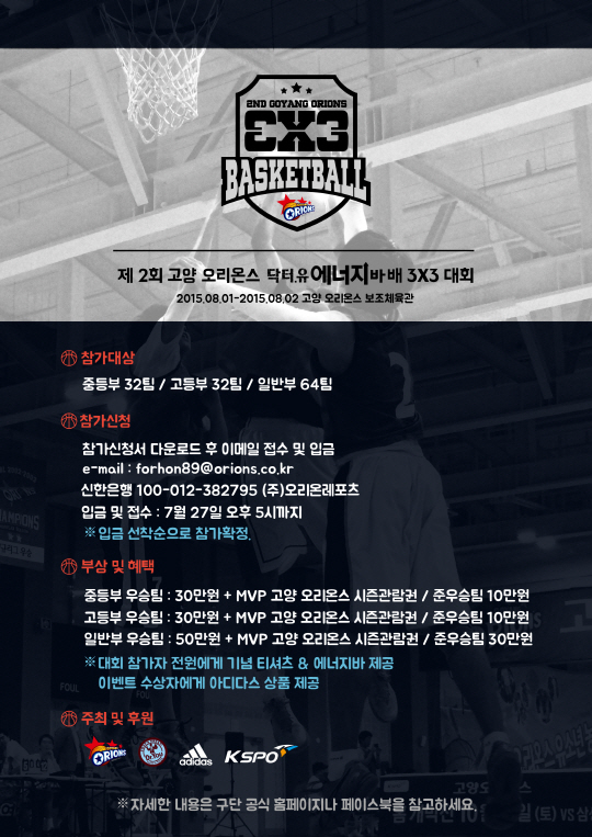 남자농구 오리온스가 8월 1~2일 이틀 동안 제2회 고양 오리온스 '닥터유 에너지바배' 3 ON 3 대회를 개최한다.