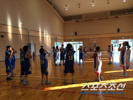 ◇제3회 하나투어 전국 다문화&유소년 농구대회에서 우승을 차지한 유소년팀 분당 썬더스와 다문화 농구팀 '글로벌 프렌즈'가 하나투어 지구별 여행학교 투어로 3일 일본을 방문해 후쿠오카 쿠루메 미즈마 종합체육관에서 일본 유소년팀과 친선전을 앞두고 스트레칭을 하고 있다. 후쿠오카(일본 후쿠오카현)=이원만 기자wman@sportschosun.com