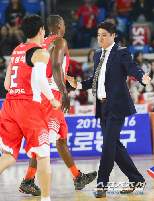 2015-2016 남자프로농구 개막전 서울 SK와 전주 KCC의 경기가 12일 서울 잠실학생체육관에서 열렸다. SK 문경은 감독이 1쿼터에서 앞서나가자 기뻐하고 있다. 잠실학생체육관=정재근 기자 cjg@sportschosun.com/2015.09.12/