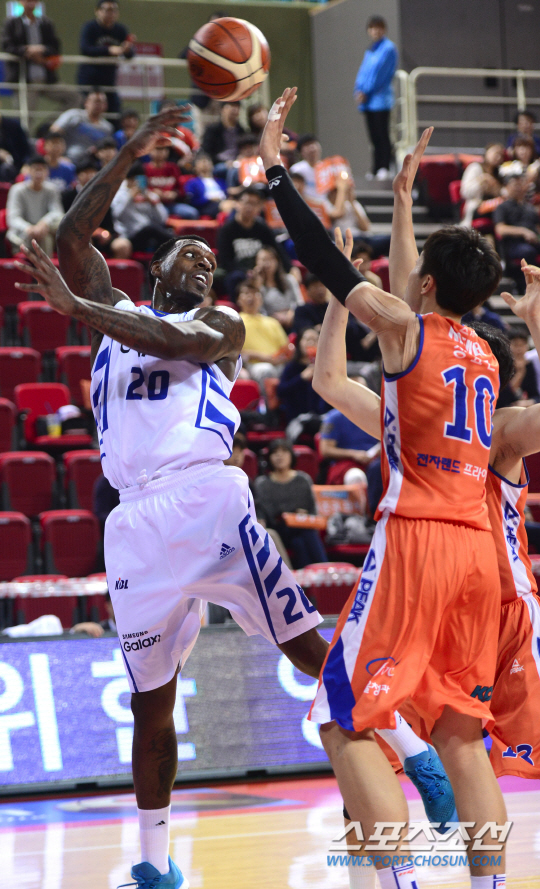 2015-2016 프로농구 서울 삼성과 인천 전자랜드의 경기가 15일 인천 삼산체육관에서 열렸다. 삼성 라틀리프가 골밑에서 전자랜드의 수비 위로 백패스를 하고 있다. 삼성은 6승 5패로 3위, 전자랜드는 5승 5패로 5위를 달리고 있다. 인천=정재근 기자 cjg@sportschosun.com/2015.10.15/