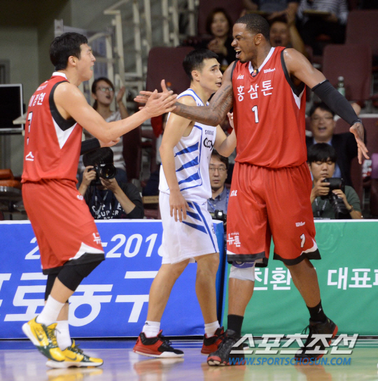안양 KGC와 서울 삼성의 2015-2016 프로농구 경기가 7일 안양실내체육관에서 열렸다. KGC 로드가 득점과 동시에 파울을 얻어낸 후 이정현과 기쁨을 나누고 있다. 안양=허상욱 기자 wook@sportschosun.com/2015.10.07/