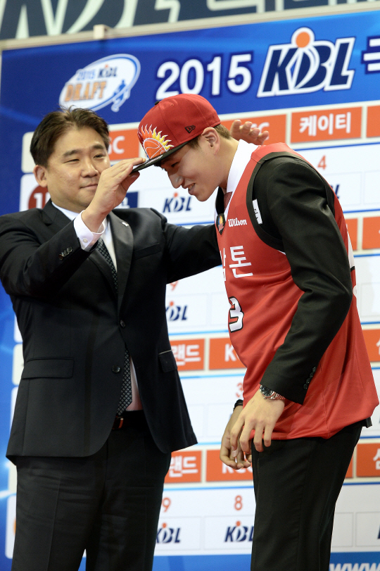 김승기 안양 KGC 감독이 1라운드 1순위로 지명한 문성곤에게 구단 모자를 씌워주고 있다. 사진제공=KBL