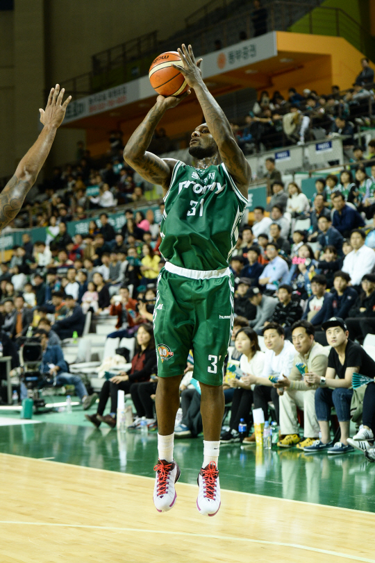 원주 동부 외국인 선수 웬델 맥키네스가 4일 원주실내체육관에서 열린 부산 kt전에서 슛을 던지고 있다. 사진제공=KBL