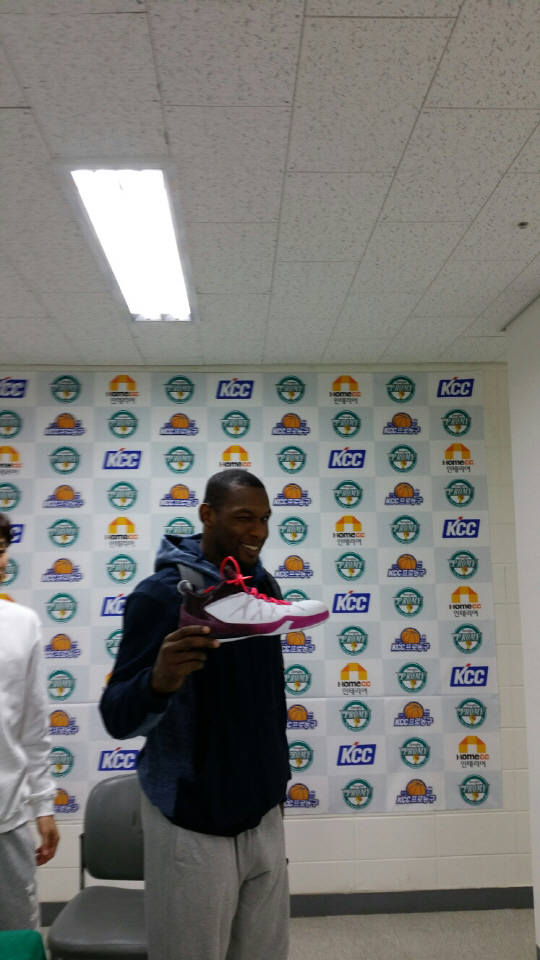 원주 동부의 외국인 선수 웬델 맥키네스가 4일 원주실내체육관 인터뷰룸을 나서면서 김주성이 줬다는 농구화를 들어보이고 있다. 원주=민창기 기자 huelva@sportschosun.com