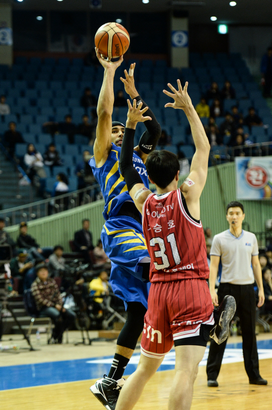| 서울 삼성 썬더스 문태영이 28일 창원 LG 세이커스전에서 상대 선수 기승호를 앞에두고 슛을 시도하고 있다. 사진제공=KBL |